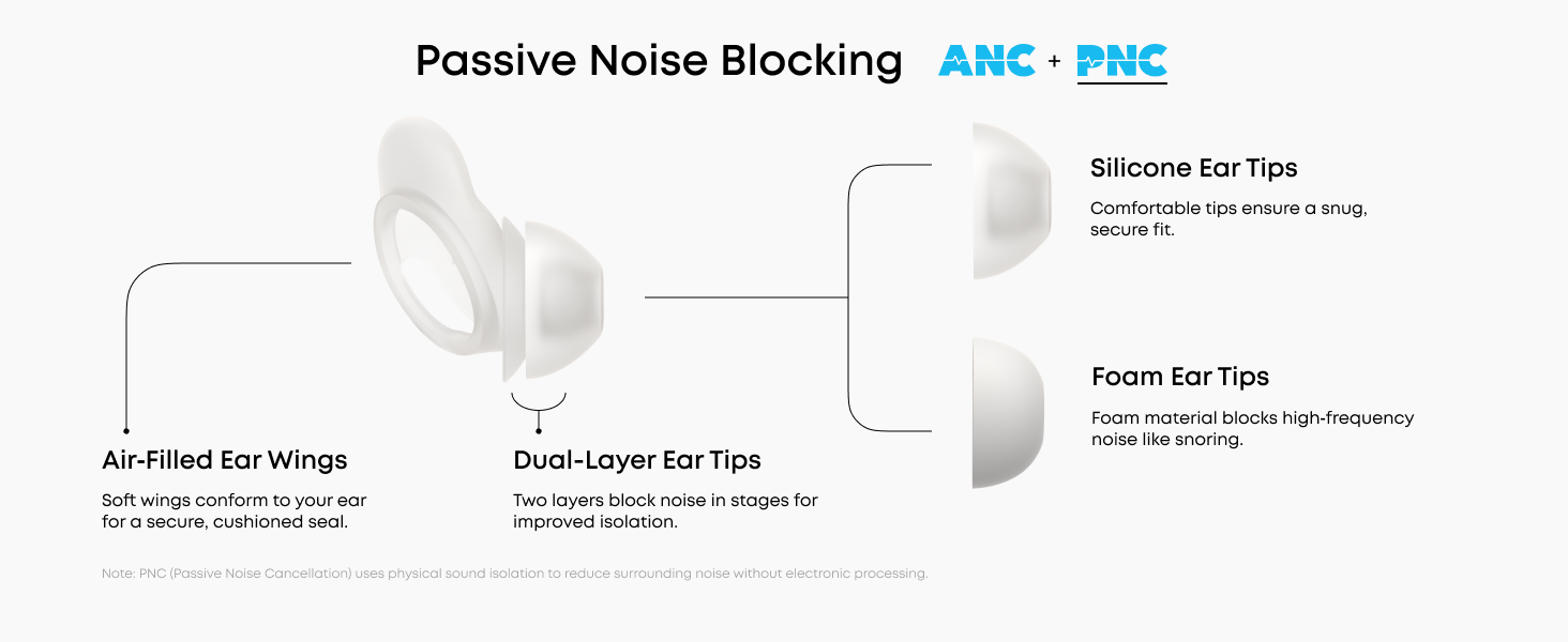 Note: Snoring sounds are masked by audio, not by the ANC system.